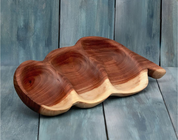 اردو خوری سه خانه مناسب برای سرو انواع آجیل و تنقلات، ساخته شده از چوب یک تکه و متراکم ملچ (نارون) و گردو به صورت کاملا دست ساز